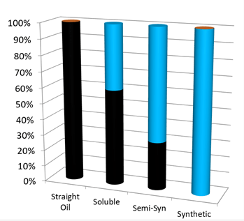 • Semi-synthetics strike a balance between cleanliness, lubrication, and heat dissipation. Containing 5-30% oil in the fluid concentrate, semi-synthetics have longer sump life and are cleaner than soluble oils.